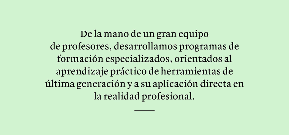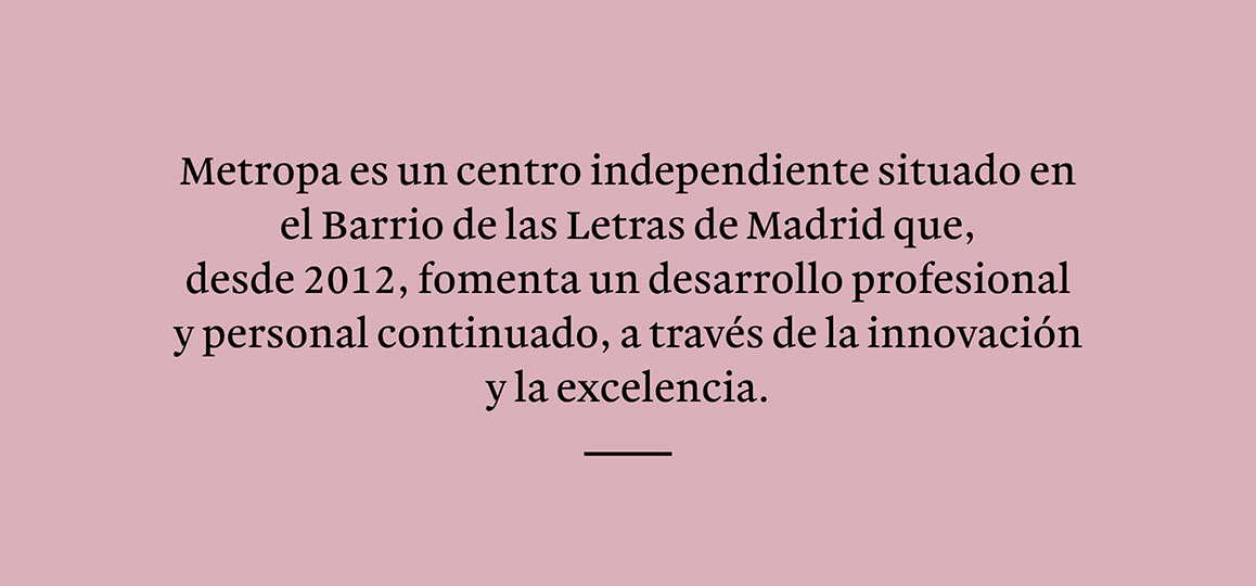 En la filosofía y esencia de Metropa está trabajar con un número de alumnos reducido, lo que, además de asegurar una atención personalizada, fomenta relaciones que puedan servir a los participantes para generar sinergias profesionales en el futuro. Ofrecemos cursos intensivos y regulares, en fin de semana o durante la misma, según cada convocatoria. Elige la que mejor se adapte a ti y forma parte de Metropa .