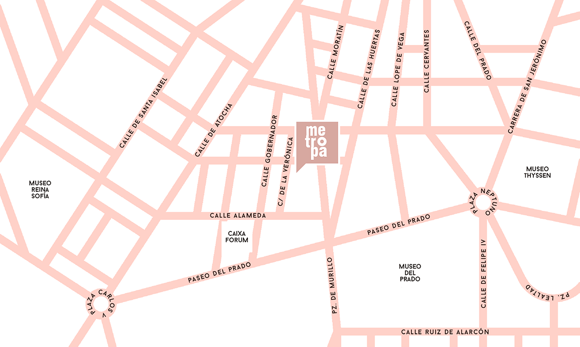 Estamos en la zona de los museos, en el baricentro del triángulo que forman el Museo del Prado, el Thyssen y el Reina Sofía, a escasos metros del CaixaForum de Herzog & de Meuron en Madrid. Estas calles del Barrio de las Letras configuran una zona llena de espacios singulares que rebosan creatividad, con vórtices como el Intermediae Prado, el Hub y La Fábrica, que junto con Metropa ofrecen una variada oferta cultural desde disciplinas diversas.